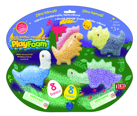 Obě sady obsahují 8 barev, tedy největší množství z prodávaných sad modelíny PlayFoam. Jednotlivé zásobníky nových balení jsou provedené do tematických atraktivních tvarů. Na blistru Dino kámošů najdete stegosaura, brontosaura, nebo např. triceratopse. Princezna si prohraje s pohádkovým kamarádem jednorožcem a po cestičce jistě trefí do svého zámku.
